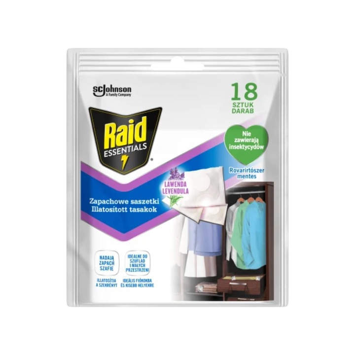 - Raid Essentials lawendowe saszetki zapachowe nieustannie uwalniają przyjemny zapach, aż do 2 miesięcy.