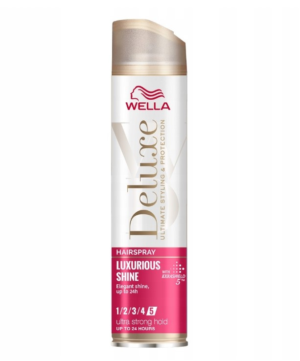 Ultra mocny lakier do włosów nadający piękny połysk Wella Deluxe z keratynowym kompleksem ochronnym KERASHIELD 5™, chroniącym przed 5 oznakami zniszczenia włosów.