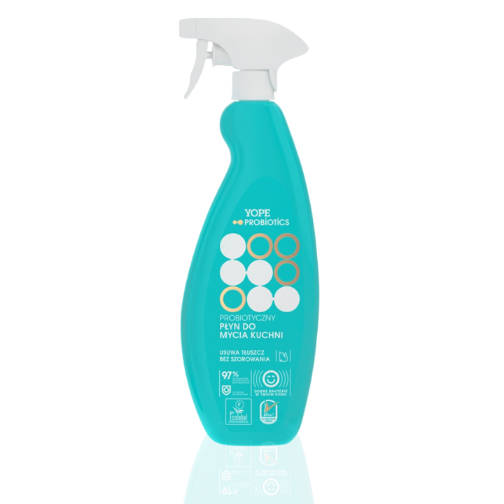 Probiotyczny płyn do mycia kuchni Yope Probiotics skutecznie i bez szorowania usuwa mocne zabrudzenia oraz osady z tłuszczu ze wszystkich zmywalnych powierzchni kuchennych - od szafki po wnętrze piekarnika.